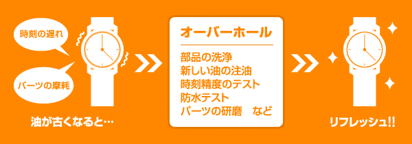 オーバーホールとは、部品の洗浄と新しい油の注油によって、時計の精度をよい状態に保つ作業の事です。